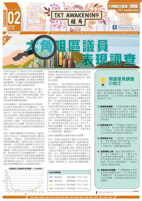調查結果來自305位大角咀居民,10分滿分,大角咀區議員的平均滿意得分為6.3分。當中,有過半數居民(63%)票投非建制派議員,即涂謹申、曾自鳴和李傲然;亦有近半數(54%)居民曾親身接觸當區區議員。