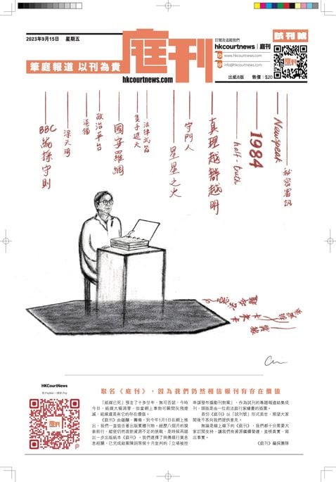 筆庭報道,以刊為貴 - 取名《庭刊》,因為我們仍然相信報刊有存在價值。「紙媒已死」預言了十多廿年,無可否認,今時今日,紙媒大幅凋零,但當網上事物可瞬間灰飛煙滅,紙媒還是有它的存在價值。《庭刊》由蘊釀、籌備,到今年1月1日在網上推出,我們一直惦念着出版實體刊物。經歷八個月的摸索前行,縱使仍然面對資源不足的挑戰,是時候再踏出一步出版紙本《庭刊》。我們選擇了與傳媒行業息息相關、已完成結案陳詞等候十月宣判的「立場被控串謀發布煽動刊物案」,作為試刊的專題報道結集成刊,頭版是由一位前法庭行家繪畫的插圖。首份《庭刊》以「試刊號」形式面世,期望大家閱後不吝向我們提供意見。無論是線上線下的《庭刊》,我們都十分需要大家訂閱支持,讓我們有資源繼續營運,直視真實,寫出事實。《庭刊》編採團隊